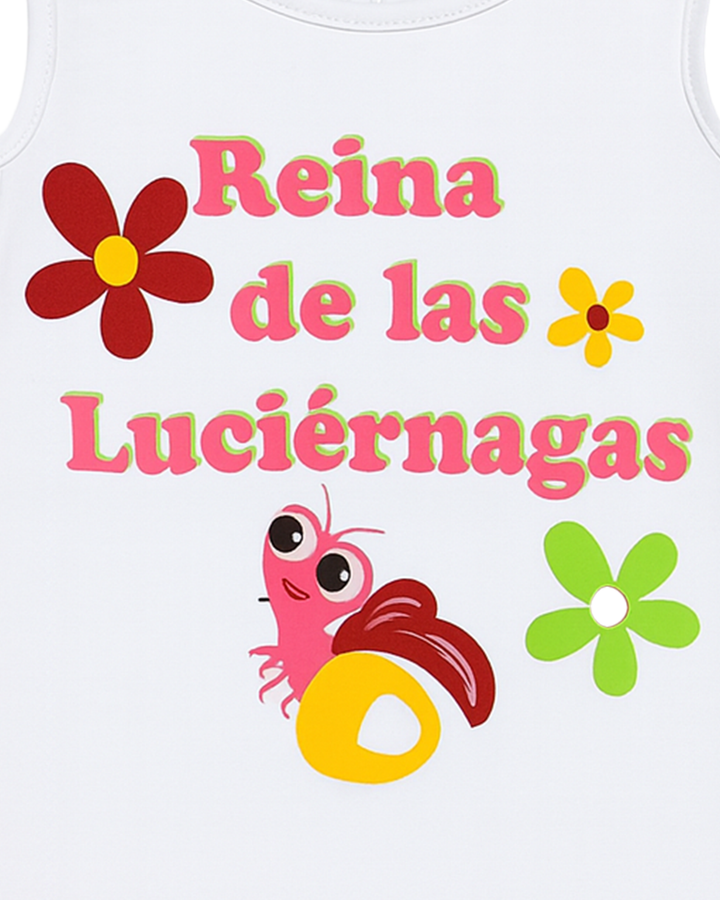 ✅ Diseño: Blusa de corte recto y holgado con un moderno diseño de hombros descubiertos (cut-out shoulders o "hombros fríos"). Presenta un estampado frontal alegre que incluye la frase "Reina de las Luciérnagas" en letras rosas y verdes, junto con una divertida luciérnaga de dibujo animado y flores.