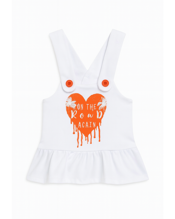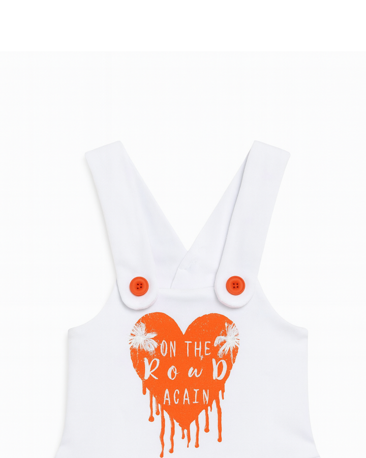 ✅ Detalles adicionales: Los botones y el lazo naranja añaden un contraste llamativo y coordinado. El estampado de corazón y el mensaje evocan un espíritu aventurero y divertido. El bajo fruncido le da un toque femenino y juvenil.