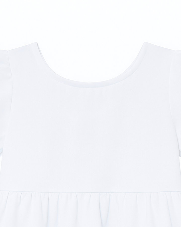 ✅ Diseño: Corte amplio con vuelo en el bajo, mangas bombachas con elástico y escote cuadrado. La parte trasera presenta una abertura con moño ajustable que añade un toque delicado.
