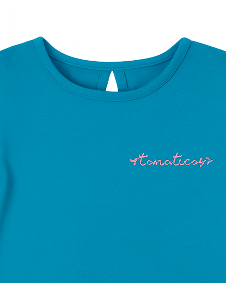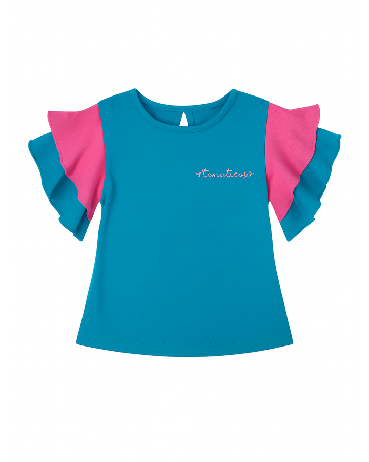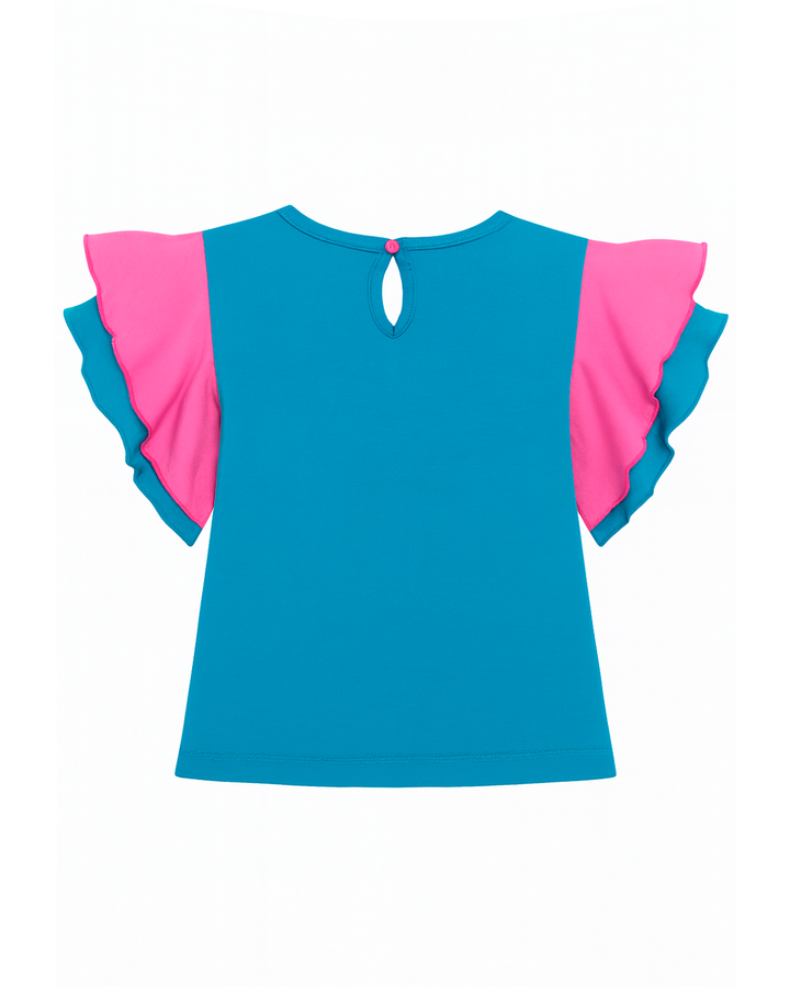 🌈 Color: Turquesa vibrante con mangas en doble volante rosado.