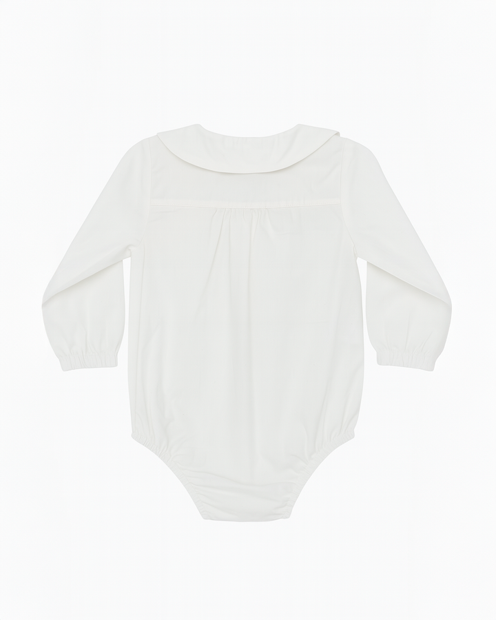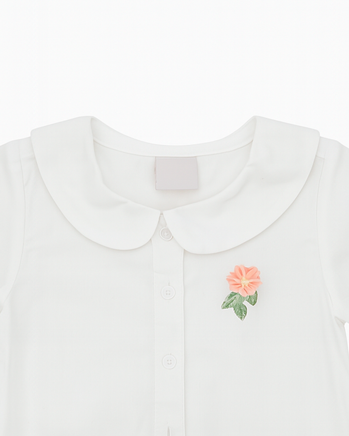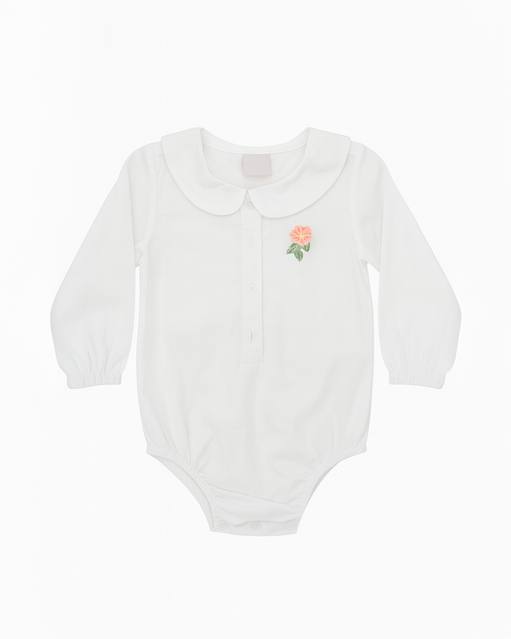 ✅ Diseño: Body de manga larga con cuello redondo tipo babero, botonadura frontal decorativa y pequeño bordado de flor con hojas en tonos durazno y verde.