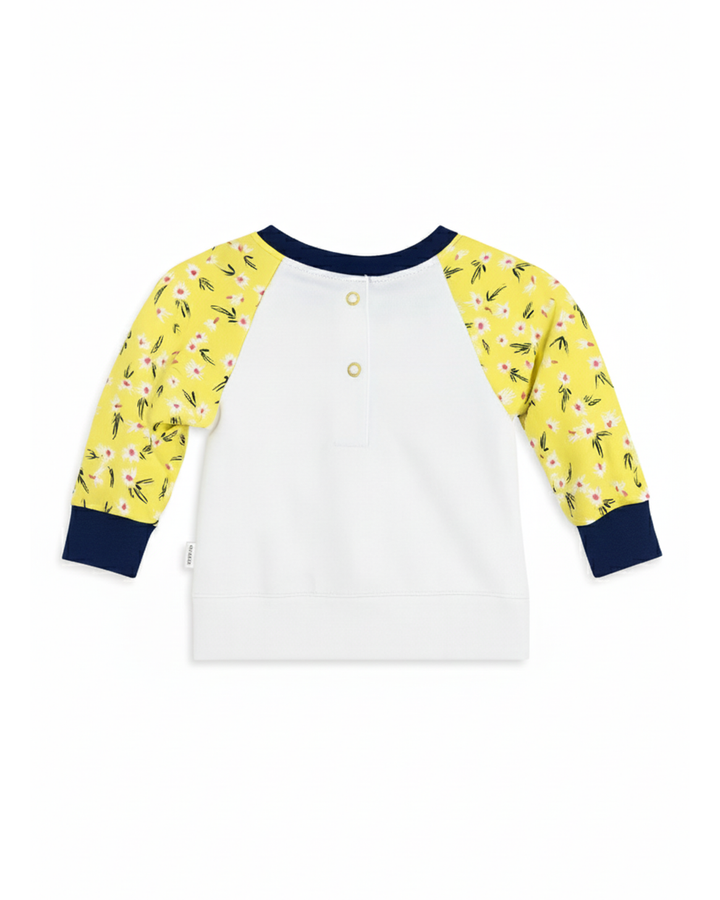 ✅ Color: Diseño de bloques de color estilo raglan (mangas) con cuerpo principal en blanco y mangas en un vibrante amarillo con estampado floral. El cuello y los puños tienen ribetes en azul marino.