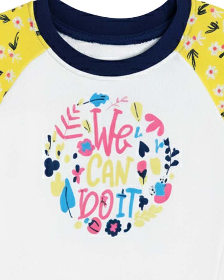 ✅ Diseño: Buzo de manga larga con diseño raglan y un mensaje inspirador en el frente: "We can do it" rodeado de un alegre círculo de elementos florales y abstractos en colores vivos (rosa, azul, amarillo).