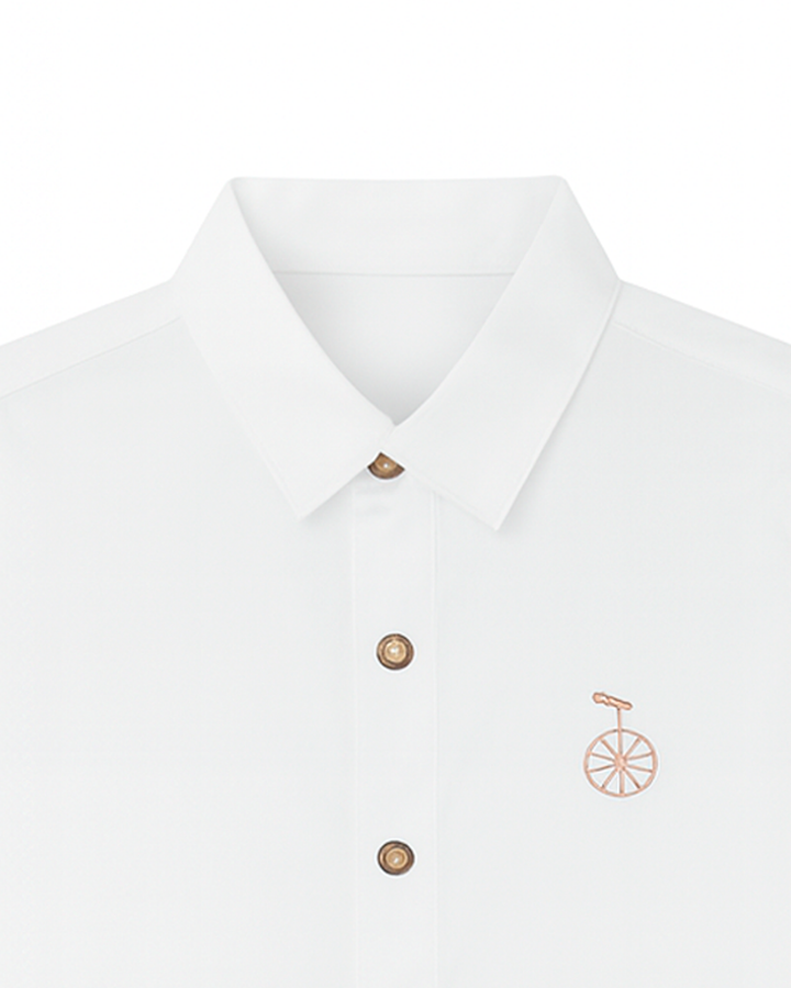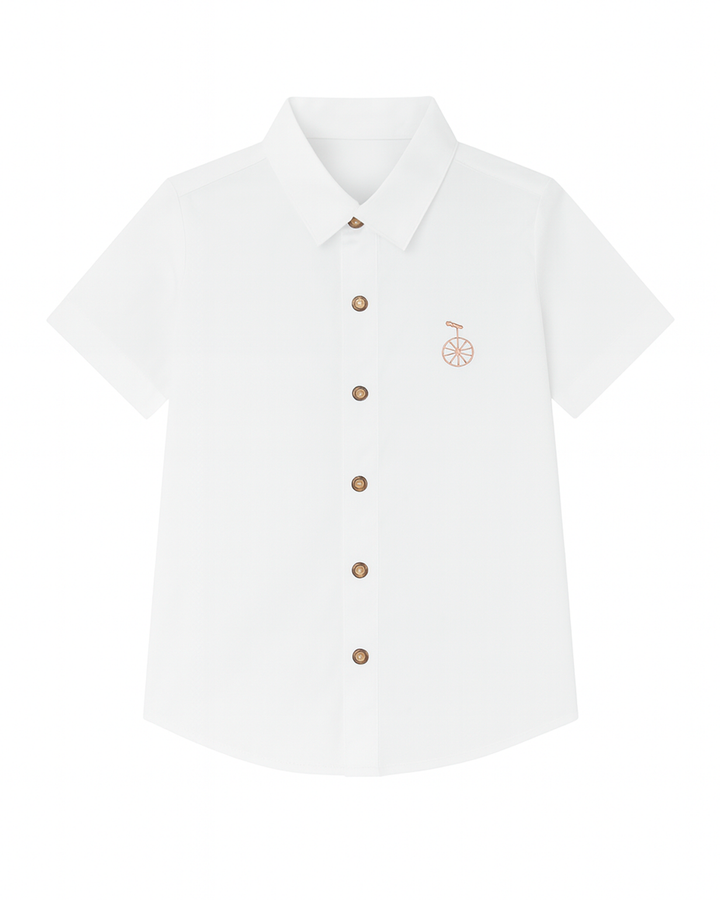 ✅ Diseño: Camisa de manga corta con botones frontales en tono madera y bordado minimalista de monociclo en color durazno.