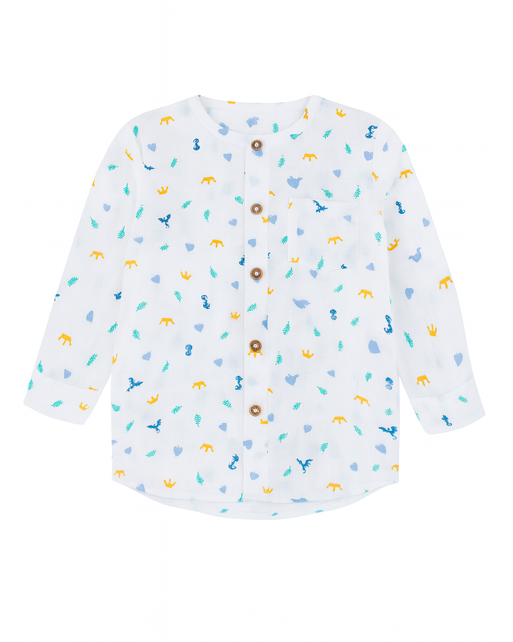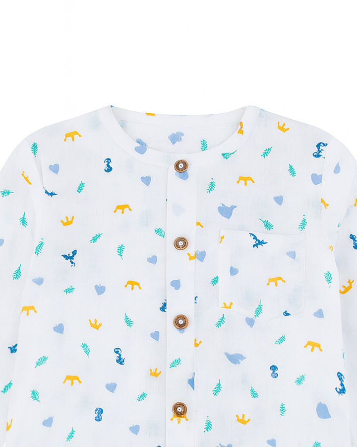 ✅ Detalles adicionales: Estampado con figuras pequeñas como coronas, animales y hojas. Incluye un bolsillo de parche en el pecho y el bajo de la camisa es curvo.