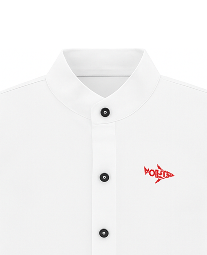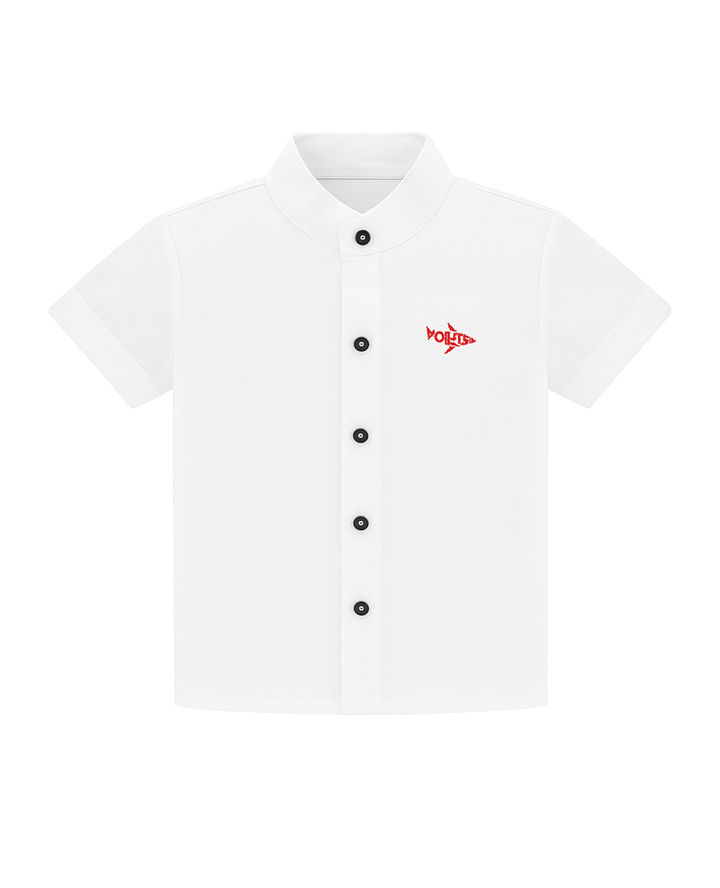 ✅ Color: Blanco clásico con detalles en negro en los botones y un pequeño bordado rojo en el pecho.