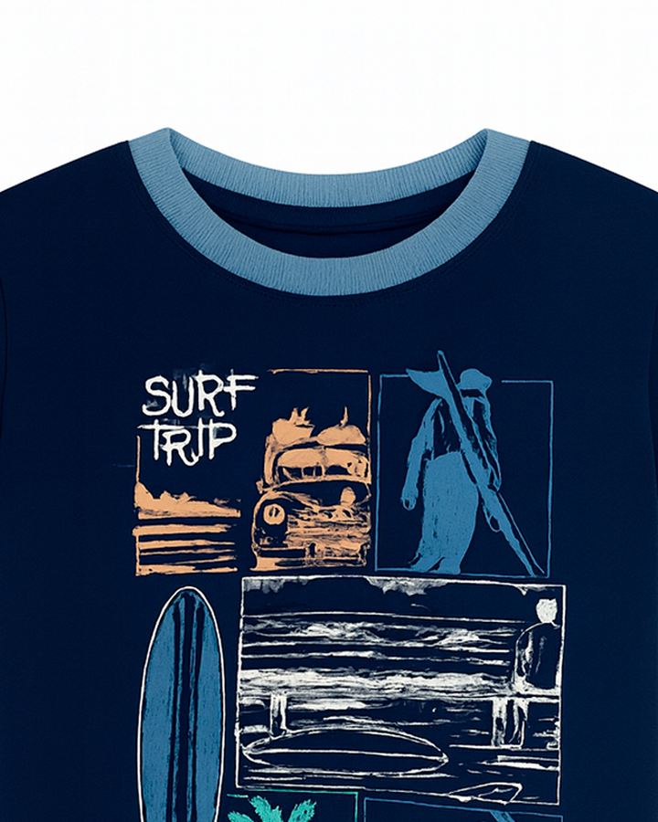 ✅ Diseño: Camiseta de manga corta con estampado gráfico inspirado en el surf: palmeras, tablas y paisajes playeros con la frase “Surf Trip”.