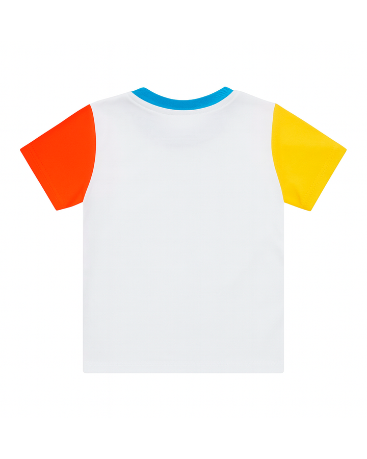 ✅ Color: Blanco con mangas en contraste —una amarilla y otra naranja— y cuello azul vibrante.