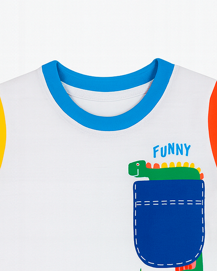 ✅ Diseño: Camiseta de manga corta con cuello redondo y divertido estampado de dinosaurio que sale de un bolsillo azul acompañado de la palabra “FUNNY”.