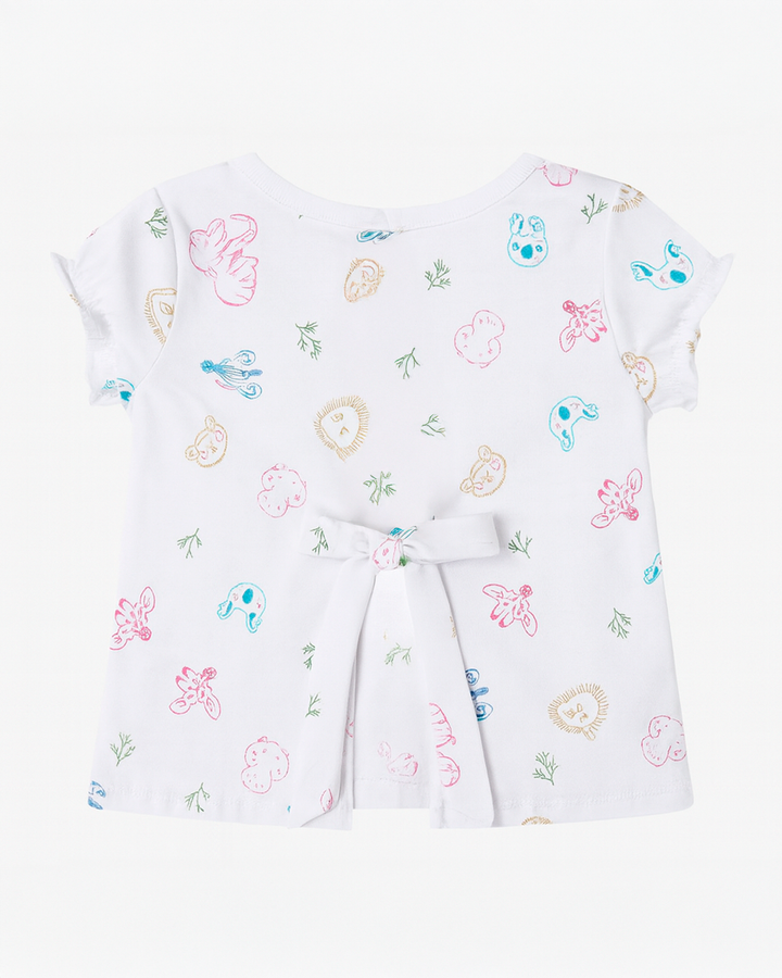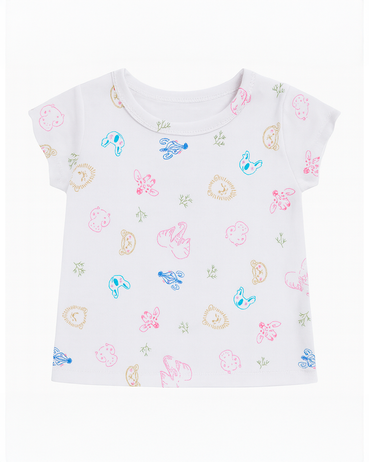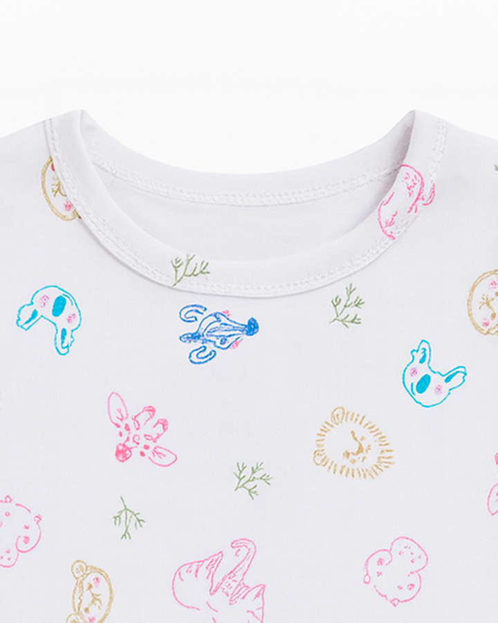 ✅ Diseño: Camiseta manga corta con ilustraciones de animalitos y plantitas en estilo doodle.