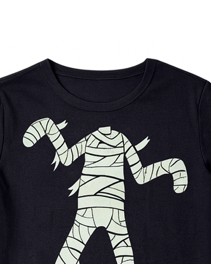 ✅ Detalles adicionales: El estampado de la momia es de color blanco/verde claro, sugiriendo que puede ser un diseño que brilla en la oscuridad.