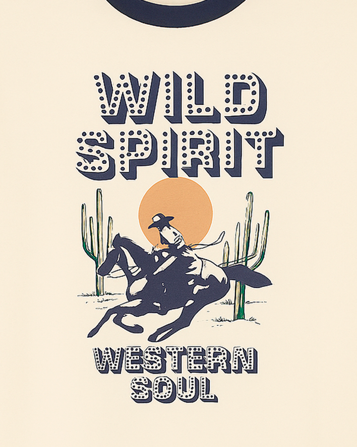 ✅ Diseño: Camiseta de corte clásico con estampado frontal de inspiración western: jinete, cactus y sol al atardecer.