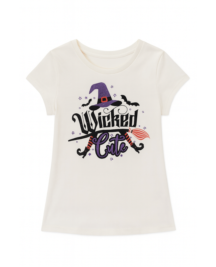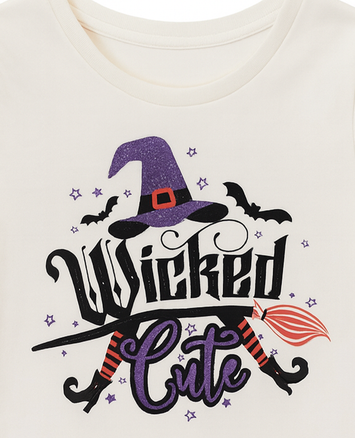 ✅ Diseño: Camiseta de manga corta con cuello redondo y estampado frontal con la frase “Wicked Cute”, acompañada de sombrero de bruja, murciélagos, estrellas y una escoba mágica.