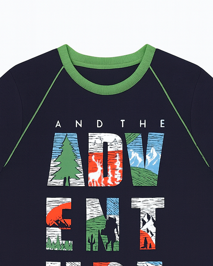 ✅ Diseño: Camiseta con estampado frontal colorido que forma la palabra ADVENTURE, con ilustraciones de montañas, árboles, fogatas y exploradores.