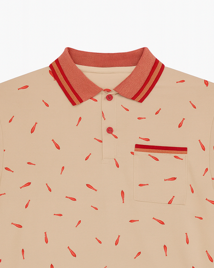 ✅ Diseño: Camiseta estilo polo de manga corta con corte clásico. Presenta un estampado all-over de pequeños motivos en color rojo/coral. Cuenta con cuello tipo polo y tapeta con dos botones a juego, además de un bolsillo de parche funcional en el pecho.