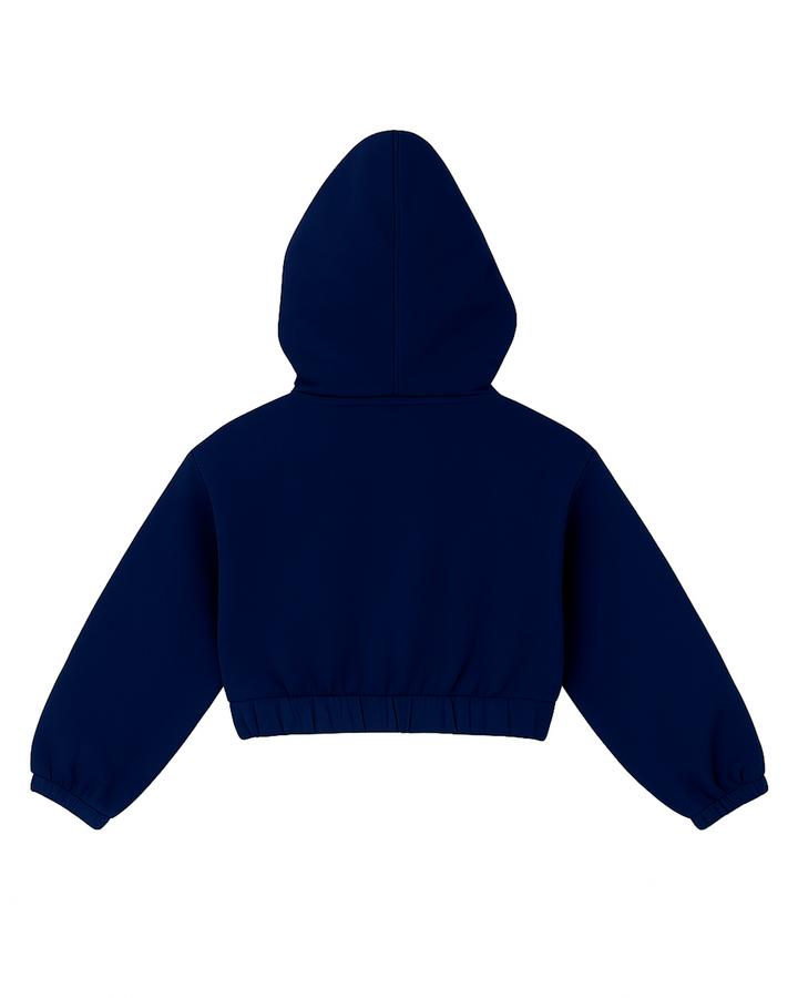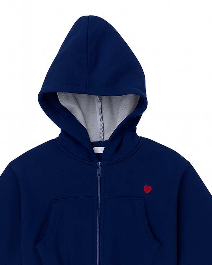 Chaqueta hoodie corta azul marino con capucha y detalle de corazón