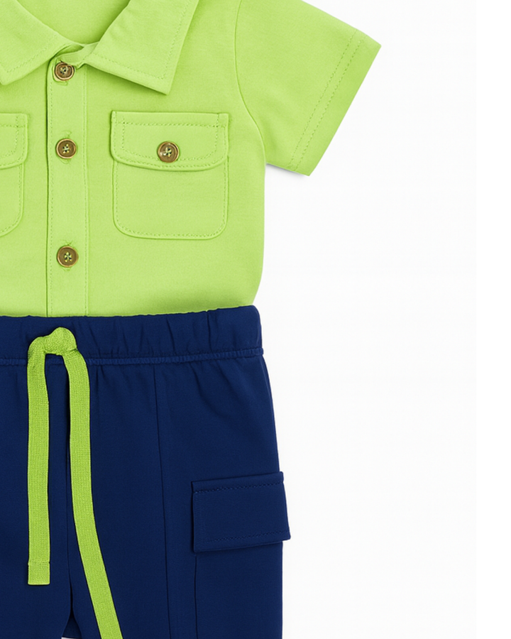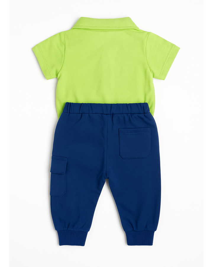 Conjunto verde limón y azul con camisa tipo polo y jogger cargo