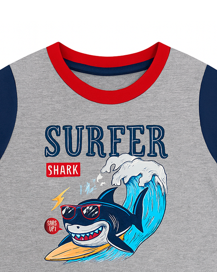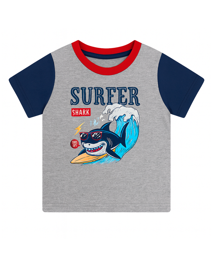 ✅ Diseño: Camiseta con divertido estampado frontal de un tiburón surfista con gafas de sol, sobre una ola azul. Incluye la frase “Surfer Shark”.