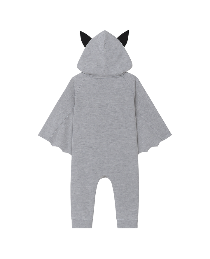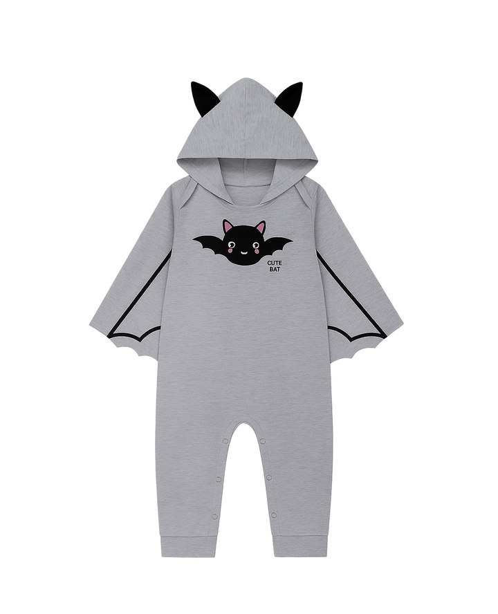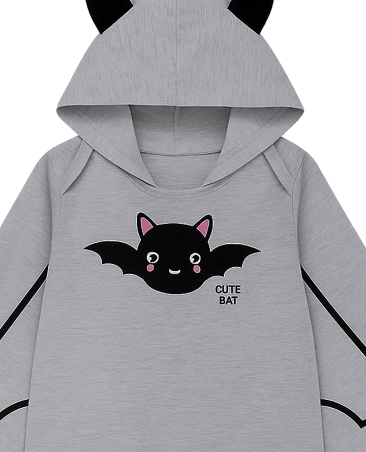 ✅ Diseño: Enterizo de manga larga con capucha que incluye orejas decorativas y alas laterales tipo murciélago. Estampado frontal de un murciélago con rostro tierno acompañado del texto “Cute Bat”. Cierre con broches a presión en la parte inferior para facilitar el cambio de pañal.