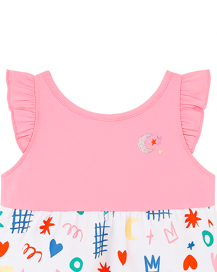 ✅ Color: Parte superior en rosa pastel combinada con parte inferior blanca estampada en tonos vibrantes como azul, verde, rojo y amarillo.