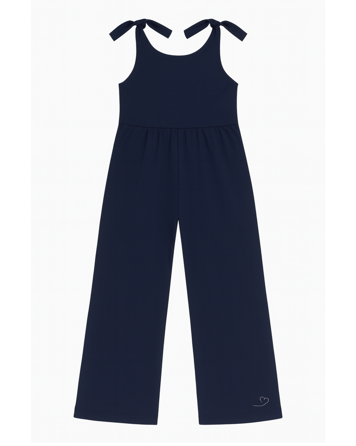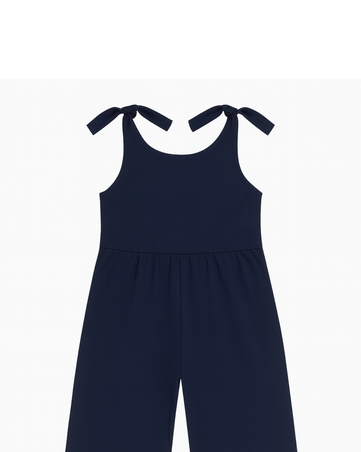 ✅ Diseño: Enterizo largo (mono) de piernas anchas o tipo palazzo. El top tiene un escote redondo. Se destaca por los tirantes que se atan con un lazo en los hombros, permitiendo un ajuste personalizado.