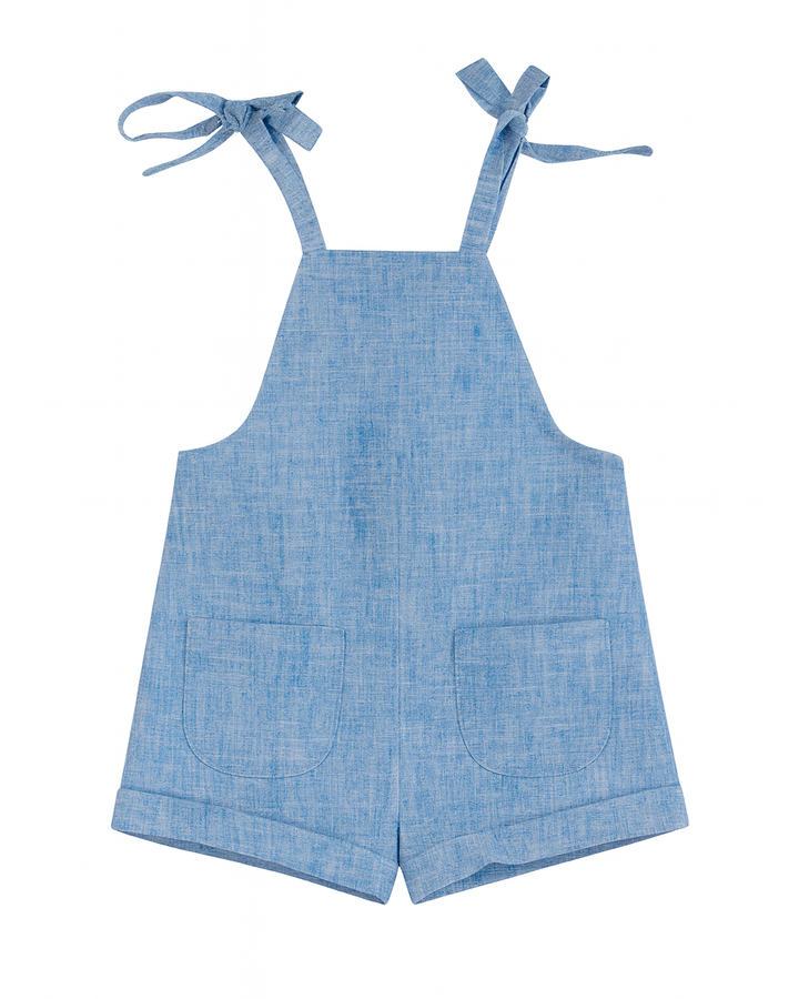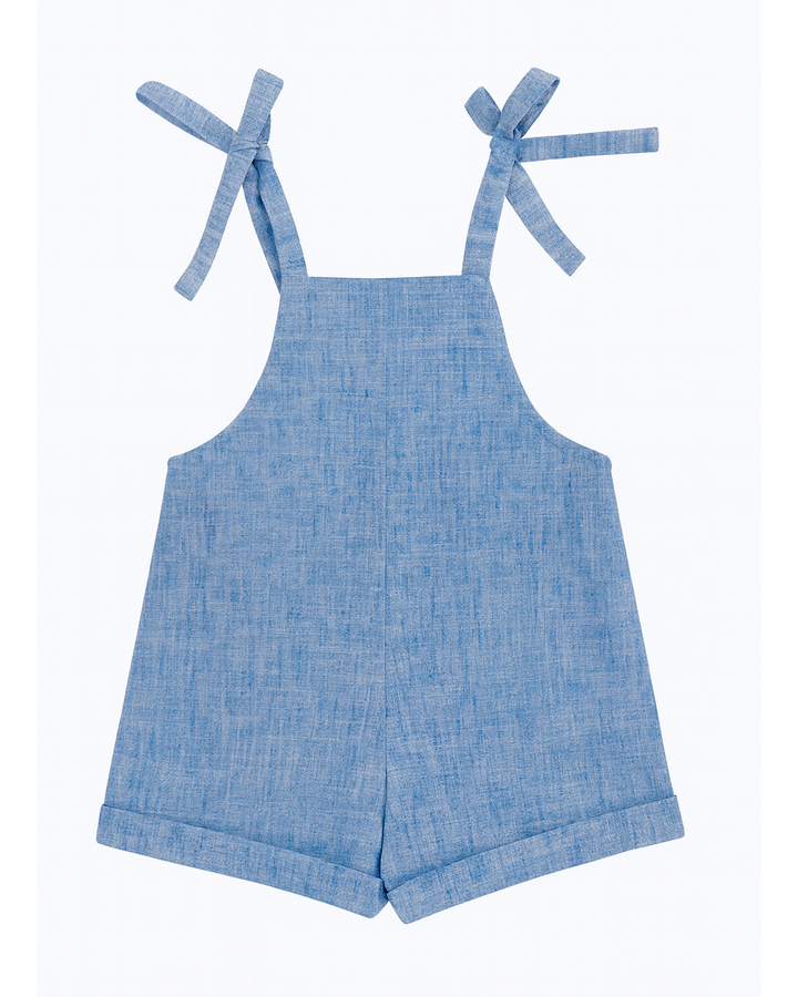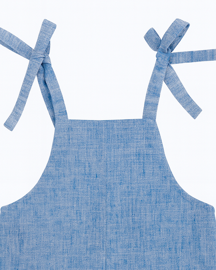 ✅ Diseño: Jardinera corta con tirantes delgados ajustables que se anudan en los hombros, dos bolsillos frontales funcionales y dobladillo en ruedo para un toque moderno.