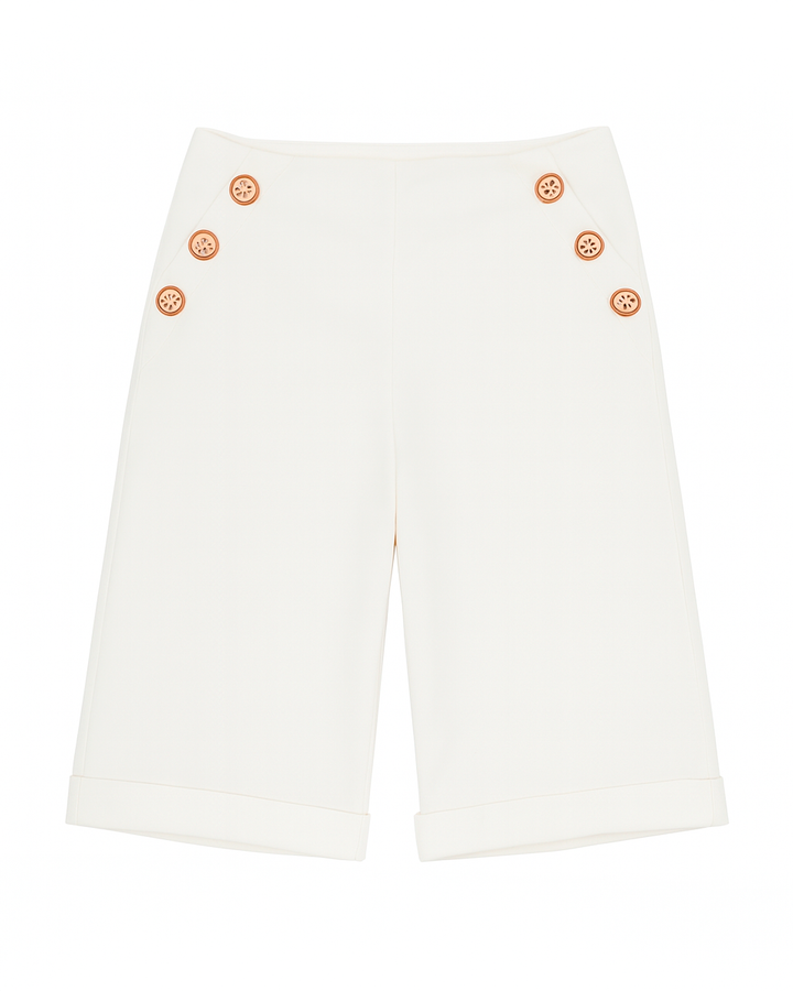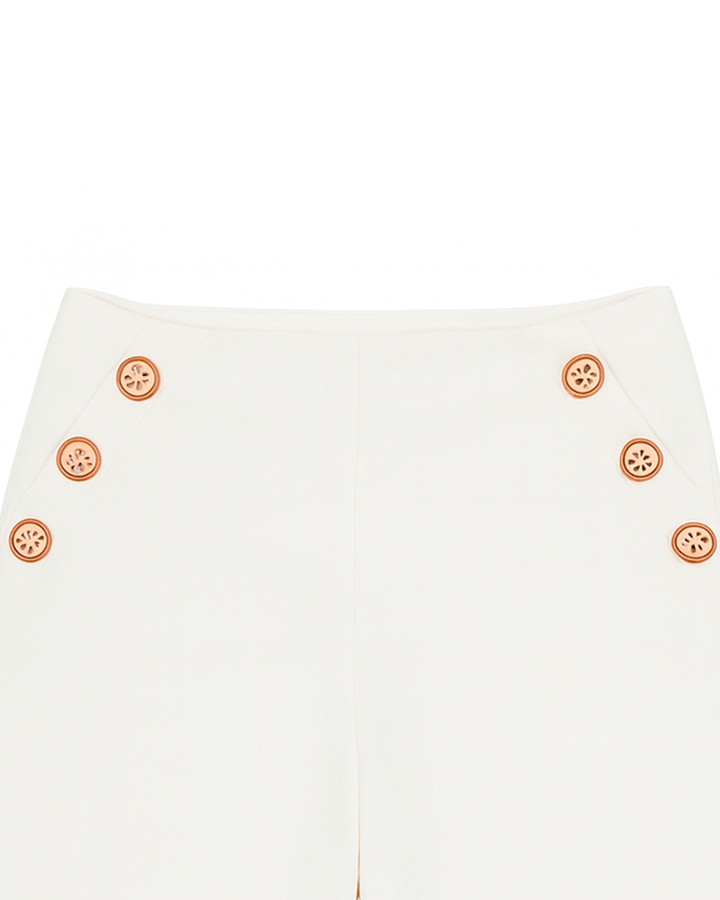 ✅ Diseño: Pantalón tipo culotte con pretina semielástica en la parte posterior para mejor ajuste. Presenta botones decorativos en el frente dispuestos en doble hilera y dobladillo vuelto en el bajo para un acabado pulido.