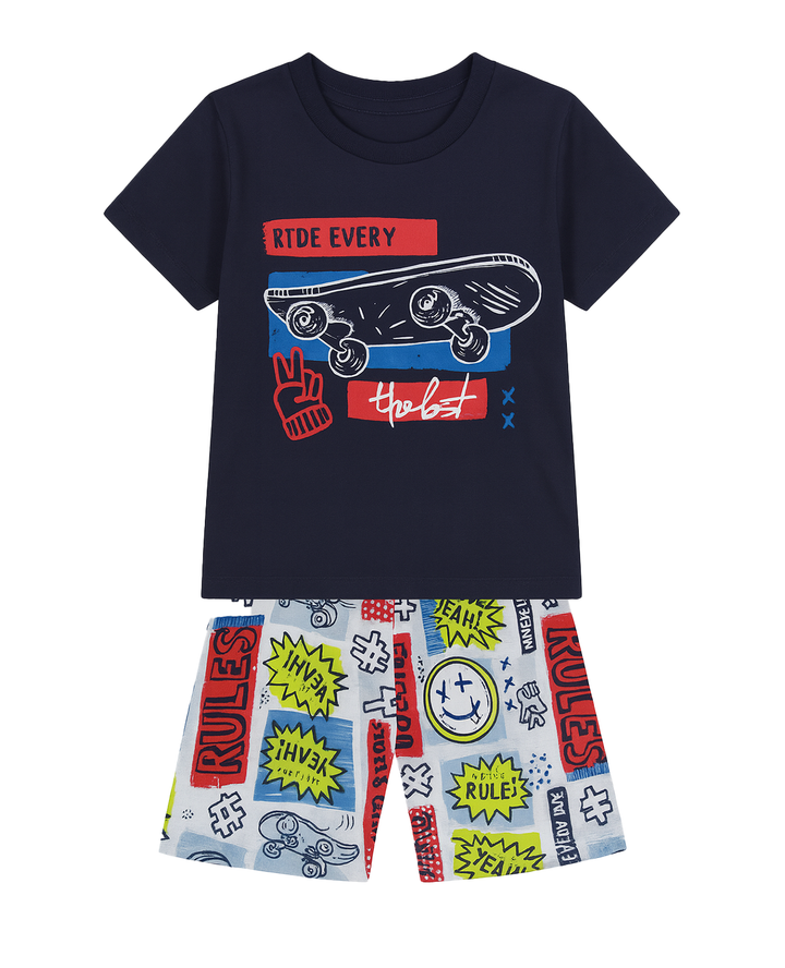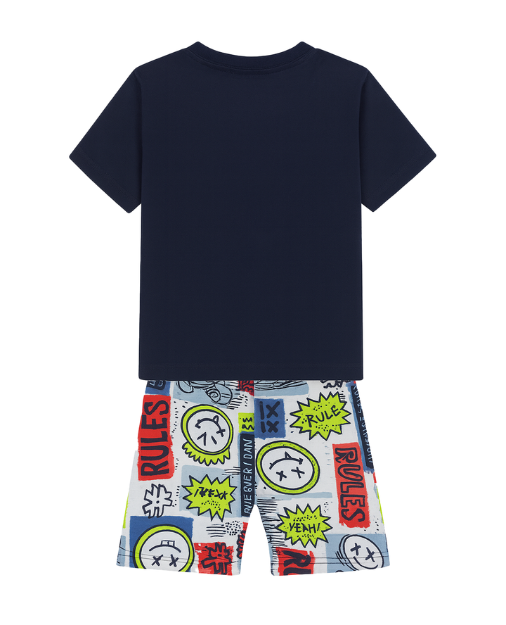 ✅ Color: Conjunto de camiseta azul marino y short gris claro con detalles en colores vibrantes como rojo, verde y azul.