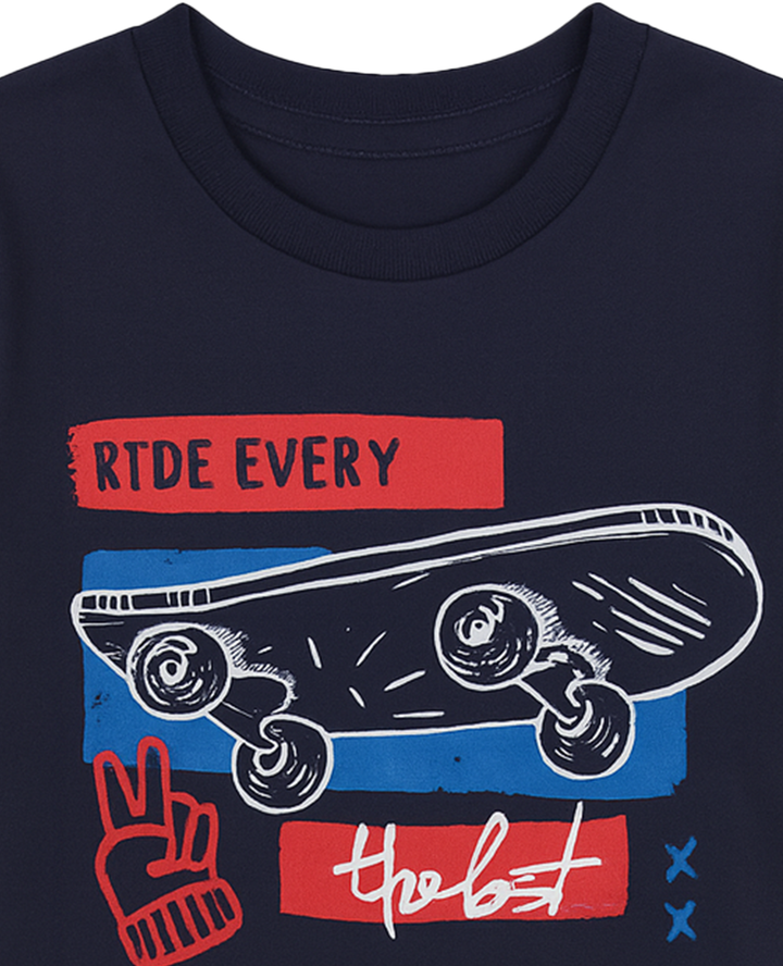 - Camiseta de manga corta con estampado frontal de patineta y frases en contraste que le dan un aire moderno y divertido.