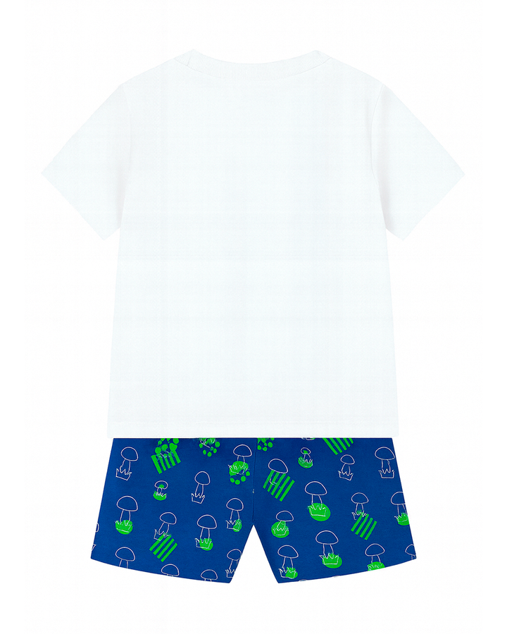 ✅ Color: Camiseta blanca con estampado azul y verde; pantaloneta azul con diseño de hongos en contraste.