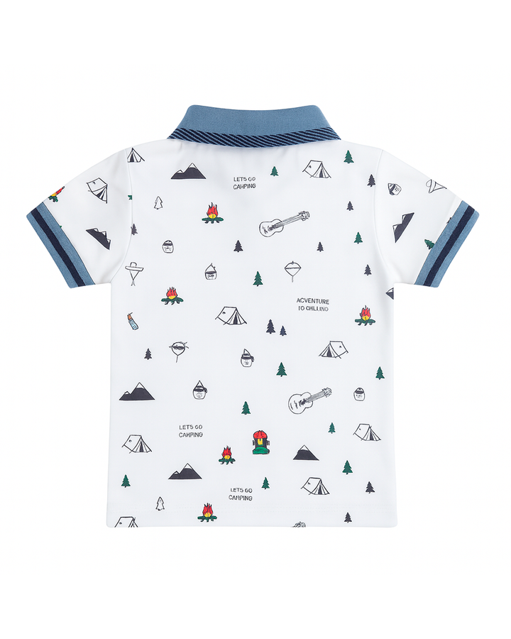 ✅ Color: Blanco con estampado multicolor de temática camping: carpas, guitarras, montañas y fogatas.