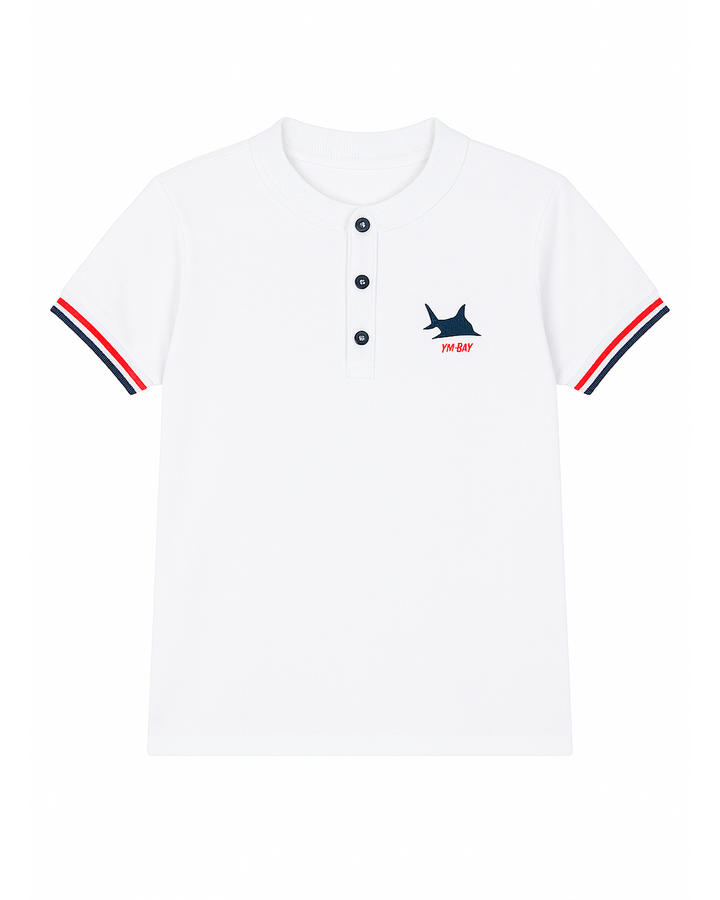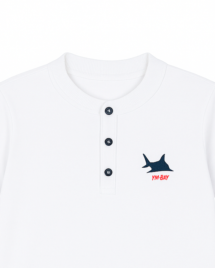✅ Diseño: Polo tipo Henley con cuello redondo acanalado y tapeta con tres botones al frente. Lleva un pequeño estampado de tiburón con el texto “YM-BAY” en el pecho.