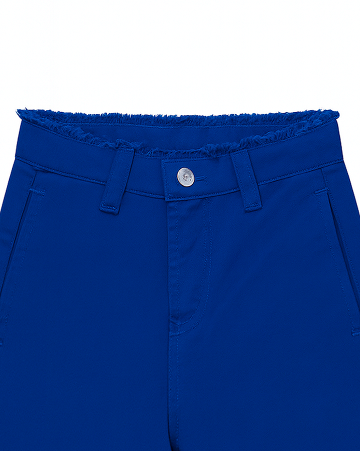 Diseño: Silueta culotte amplia y cómoda, con pretina fija y acabado deshilachado en la cintura y ruedo para un look moderno.