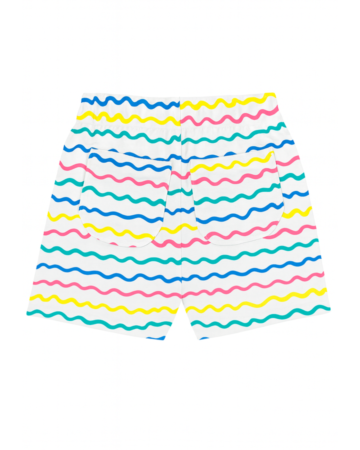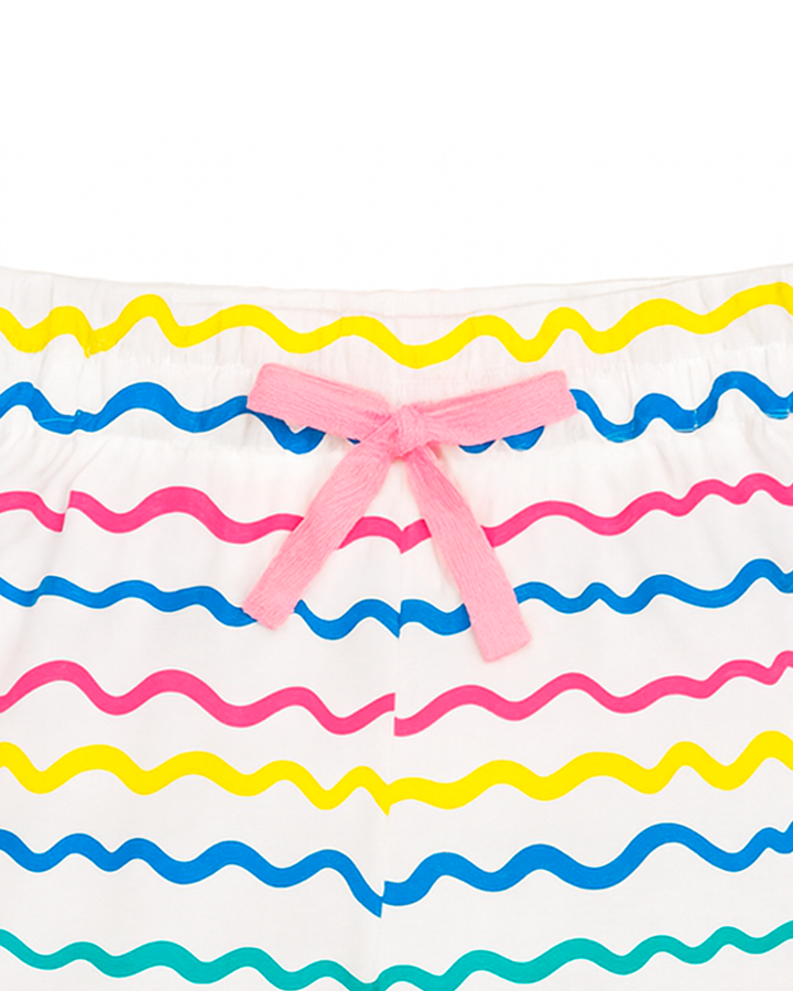 Short infantil blanco con líneas onduladas multicolor y lazo rosa