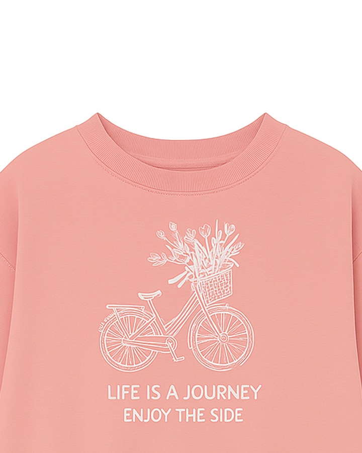 ✅ Diseño: Buzo cuello redondo con puños y basta en rib para mejor ajuste. Estampado frontal de bicicleta con flores y la frase “Life is a journey, enjoy the side”, que transmite un mensaje positivo y encantador.
